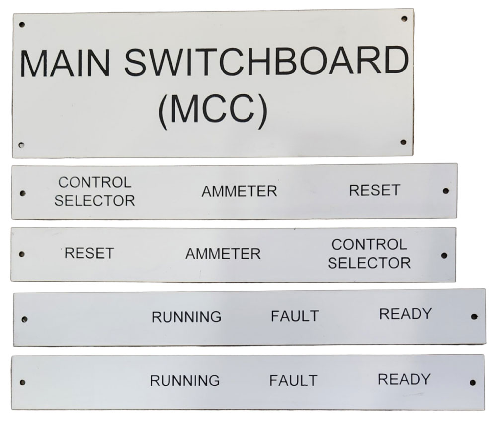 We also specialise in large format machinery nameplates, electricial compliance and industrial stainless labels, plaques and tank guages that very few other companies in Australia can handle. Your choice of either 304 or 316 stainless steel cut to your size. Mounting holes can also be added. We are also able to mark and label your existing materials. Our staff are highly skilled in this area so you can be guaranteed that you will receive a high standard of workmanship and a full understanding of all of your requirements and specifications.
